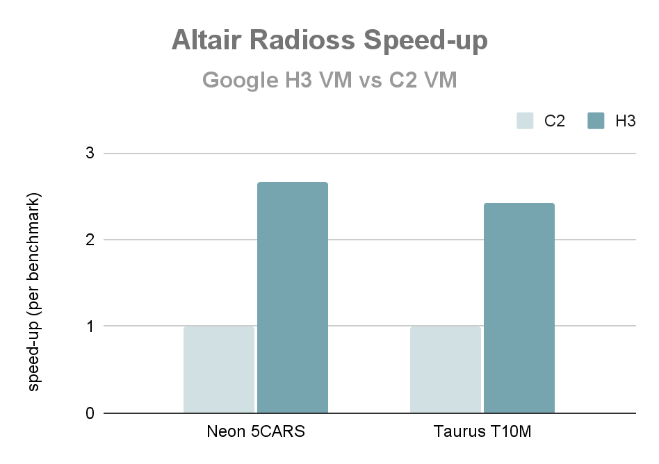 The following chart shows the single node performance of running Altair Radioss 2022.3 on the H3 VM relative to the C2 VM (whole VM in each case). The speed-up over two commonly used benchmarks (Neon 5CARS and T10M) for Altair Radioss is 2.6x.