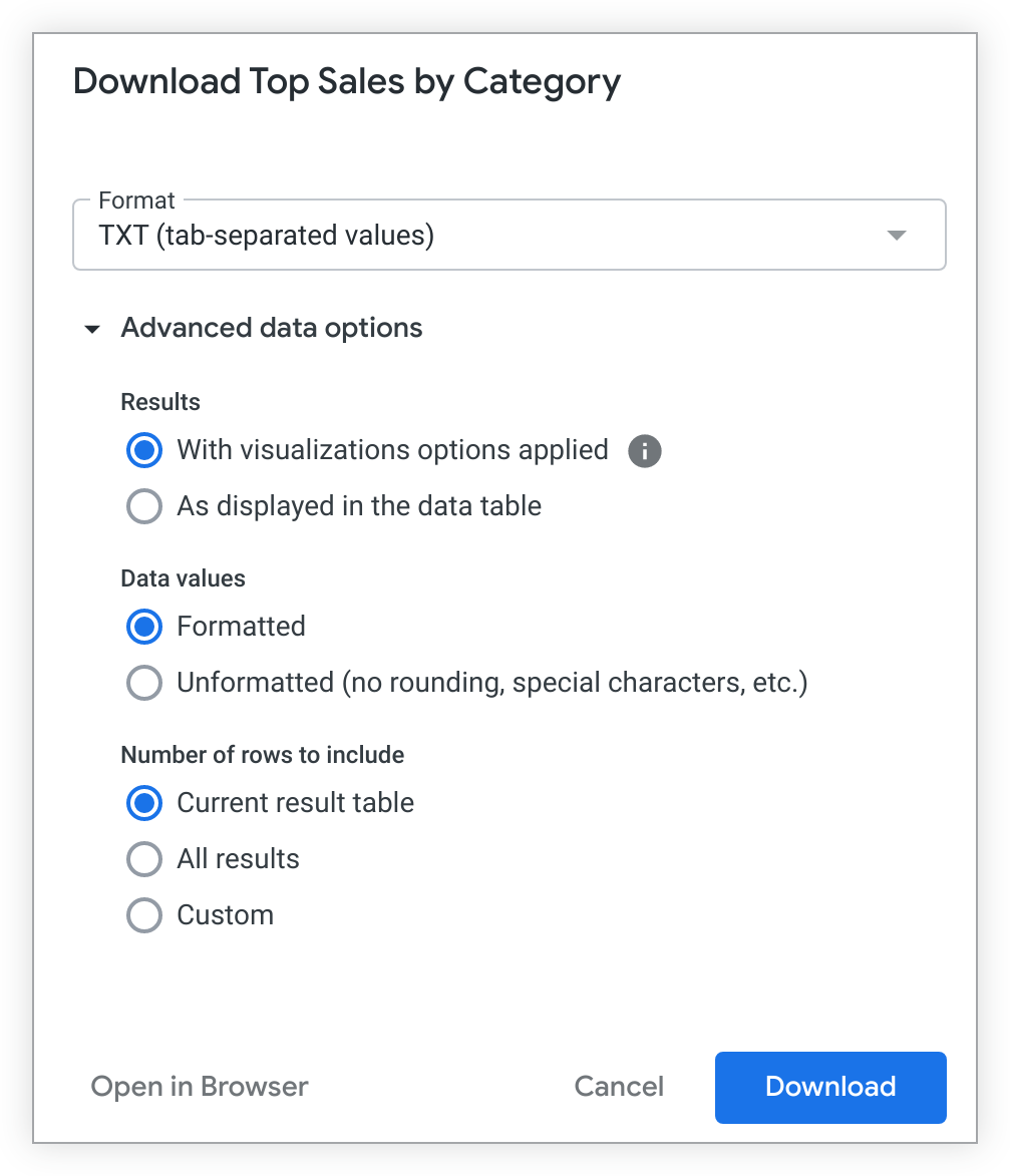 In the Data values section, choose how you want the downloaded query results to appear:
